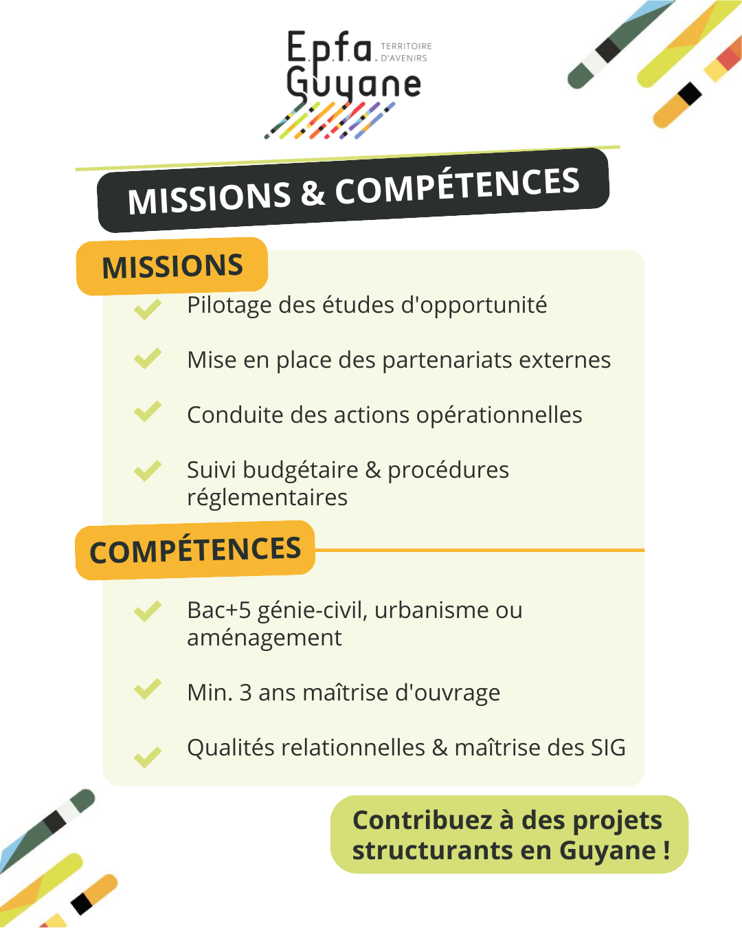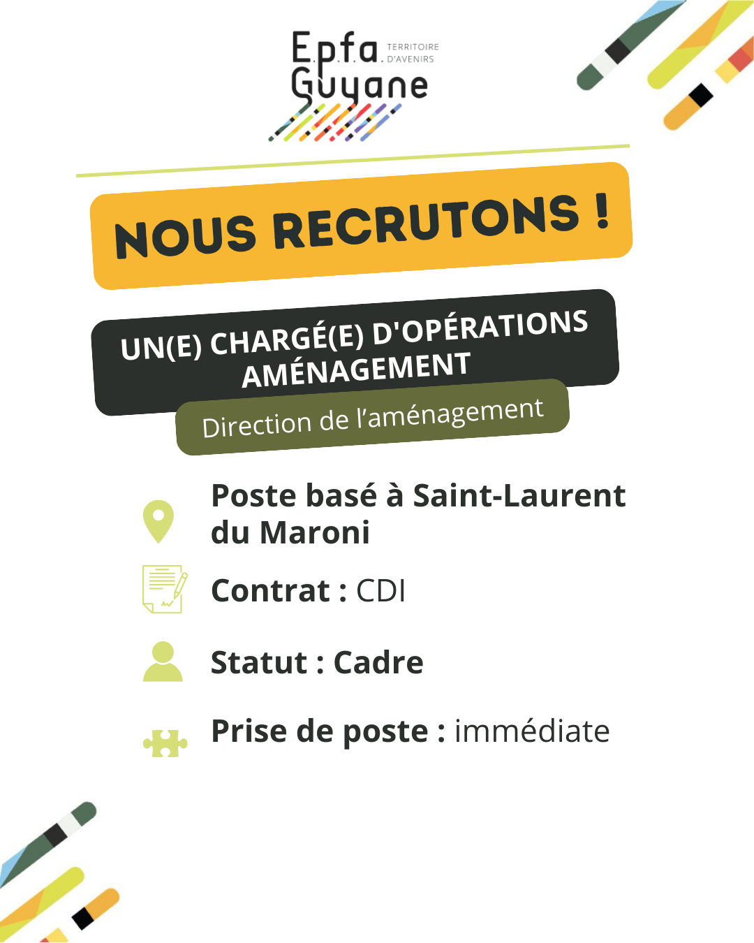 L’EPFA Guyane recrute un(e) Chargé(e) d’opérations aménagement au sein de la Direction de l’aménagement.